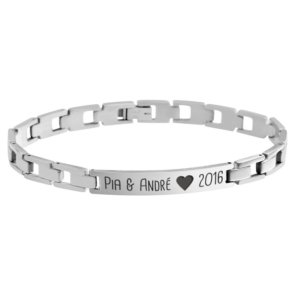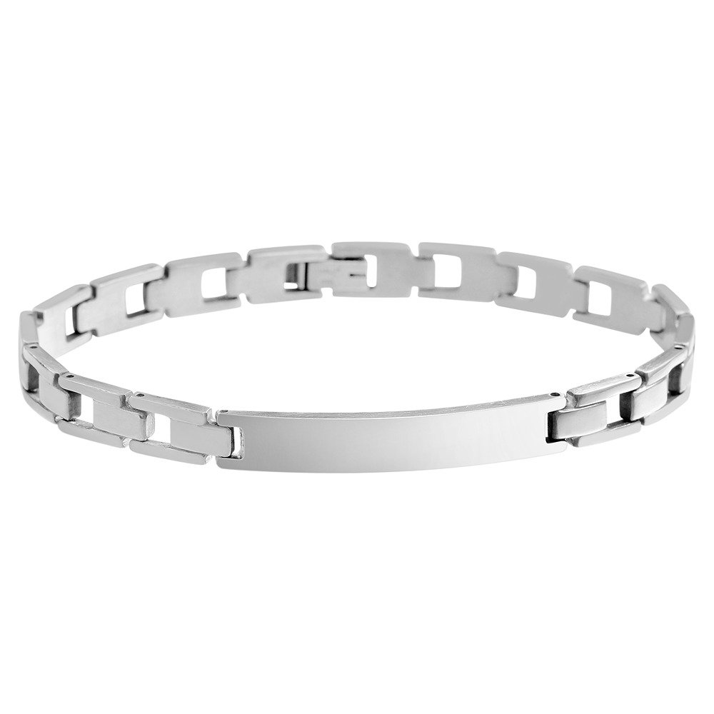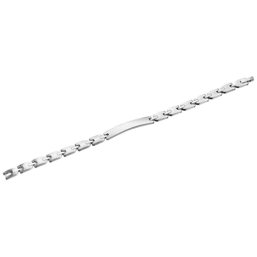 Das Schmuckarmband der Marke Akzent besteht poliertem Edelstahl, wodurch es eine moderne und stilvolle Optik erhält. Durch die Verwendung von einem hochwertigen Material ist das Armband langlebig, sehr robust und widerstandsfähig gegenüber Kratzern und Abnutzung. Zudem eignet sich Edelstahl ideal für Allergiker, da es sich als besonders hautfreundlich erweist. Die polierte Identplatte des Armbandes kann individuell nach Ihren Wünschen graviert werden, was es zu einem tollen Geschenk für besondere Anlässe werden lässt. Die einzelnen Elemente des Bandes lassen sich beliebig entfernen, sodass die Länge jedem Handgelenk angepasst werden kann. Die Größe dieses Bandes beträgt 21,5 cm, Breite 6,5 mm und Stärke 2 mm. Der Hakenverschluss ermöglicht ein schnelles und einfaches Ablegen des Schmuckstückes, ein eigenständiges Öffnen ist unmöglich. Mit diesem Edelstahlarmband erhalten Sie ein unverzichtbares Accessoire in Ihrer Schmucksammlung.
