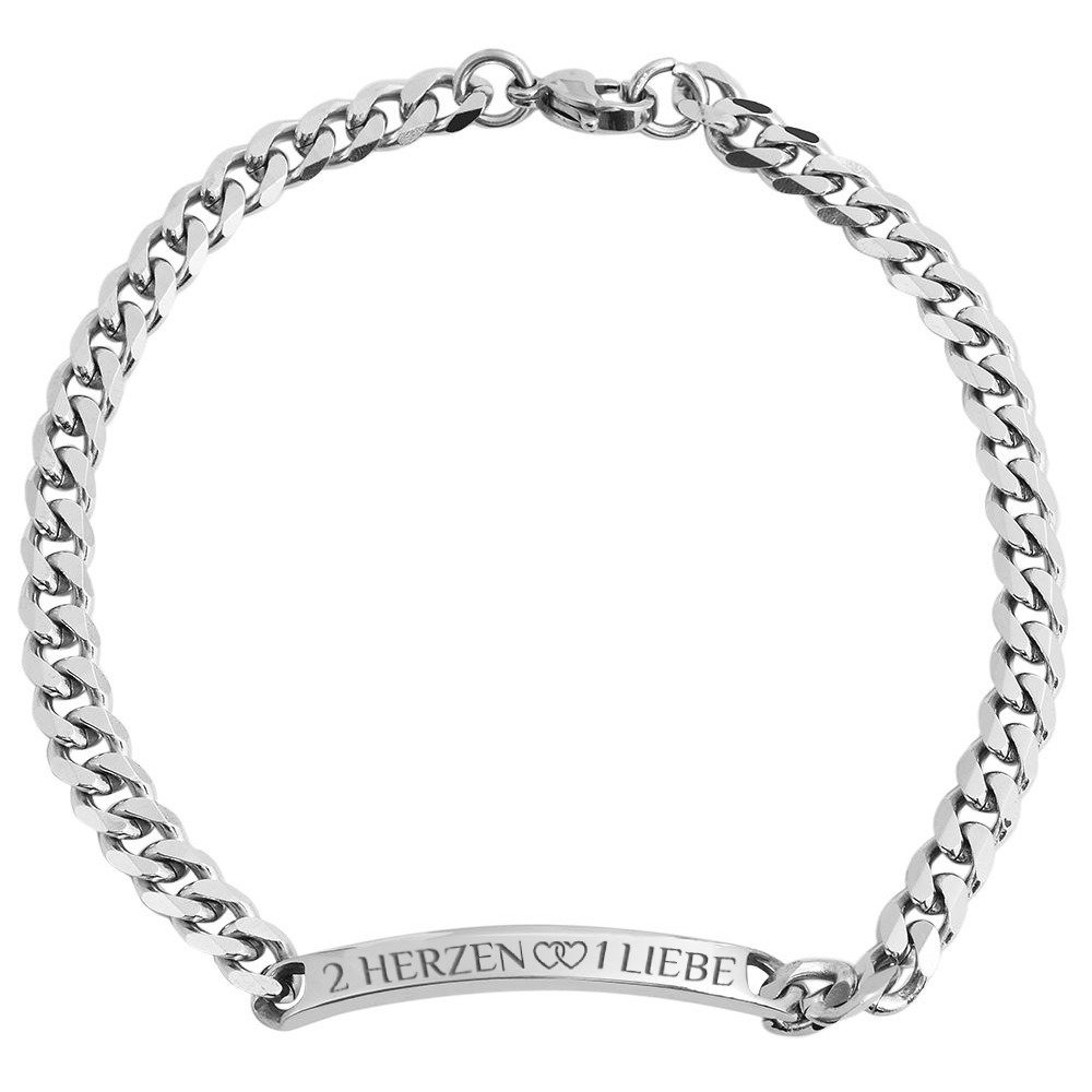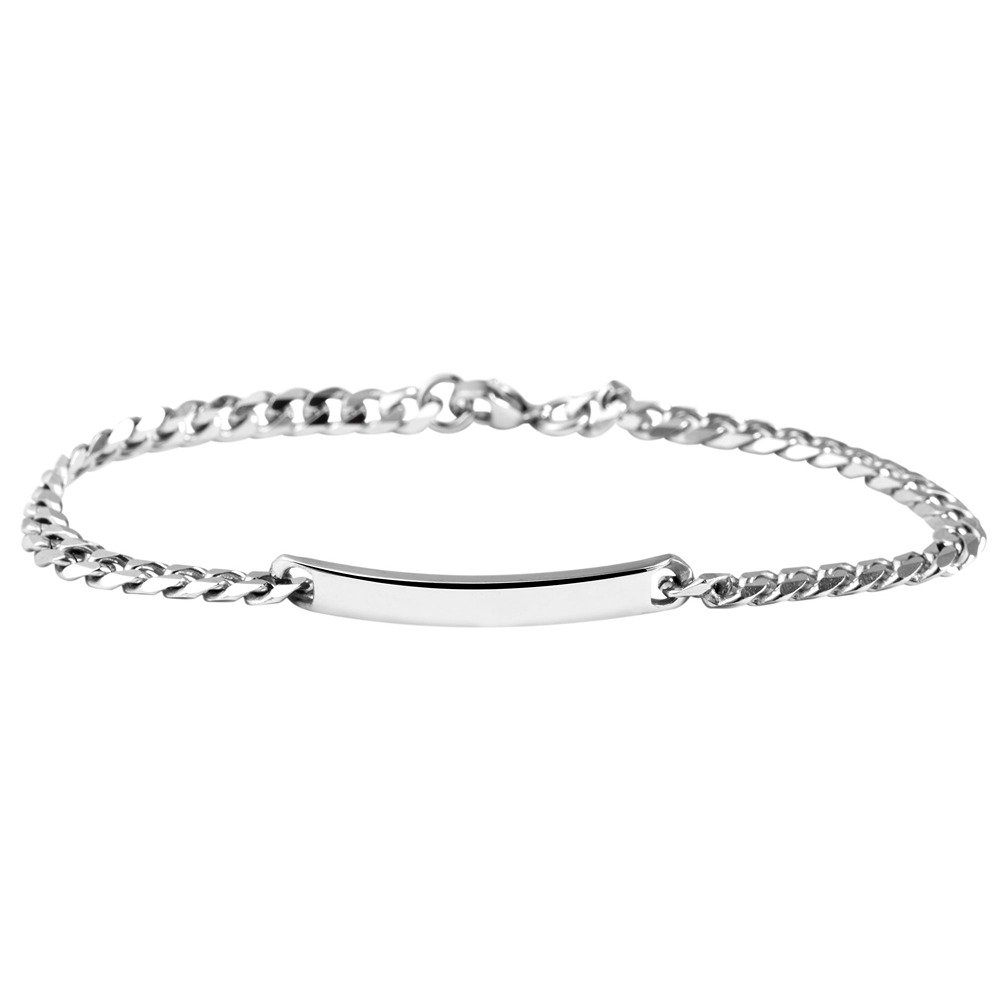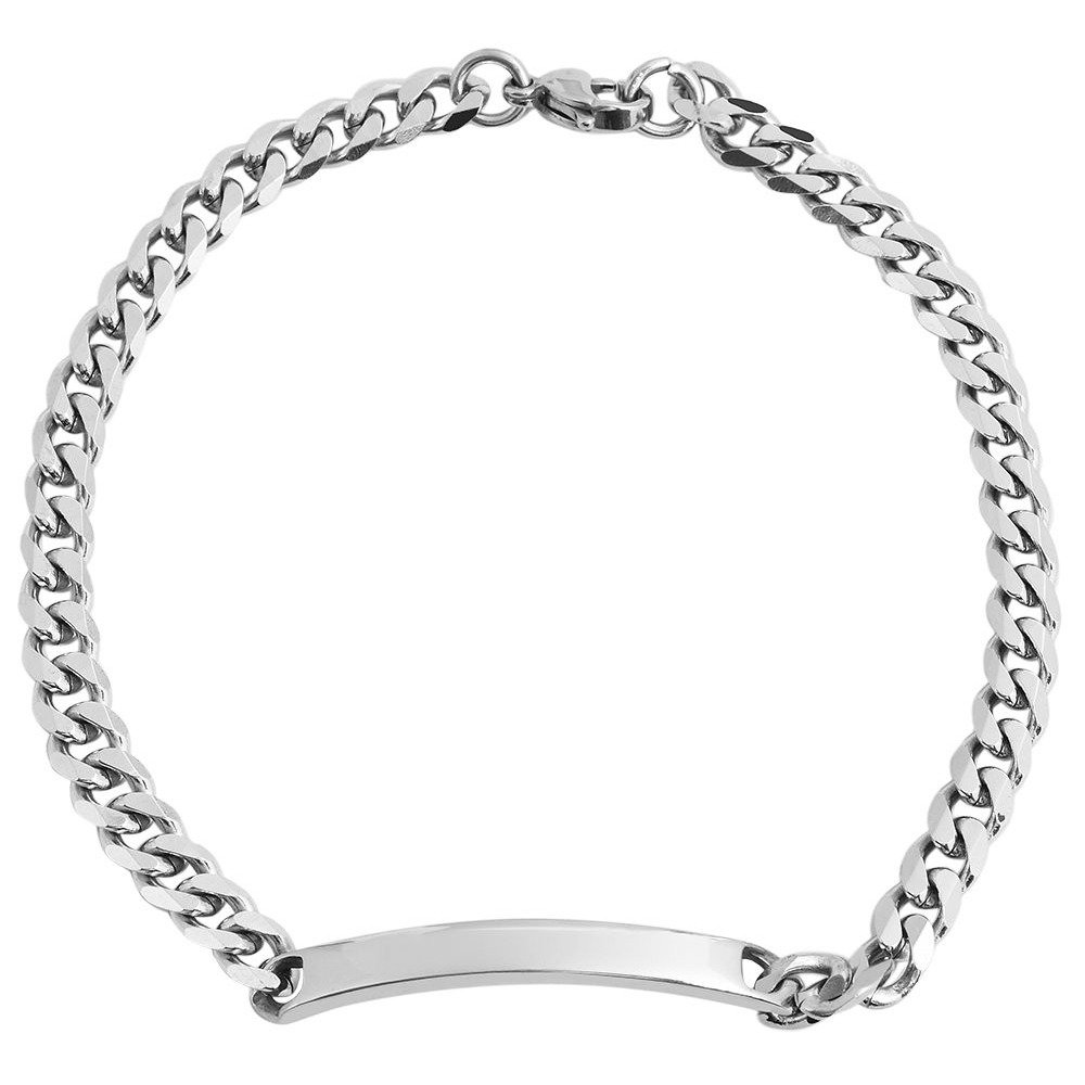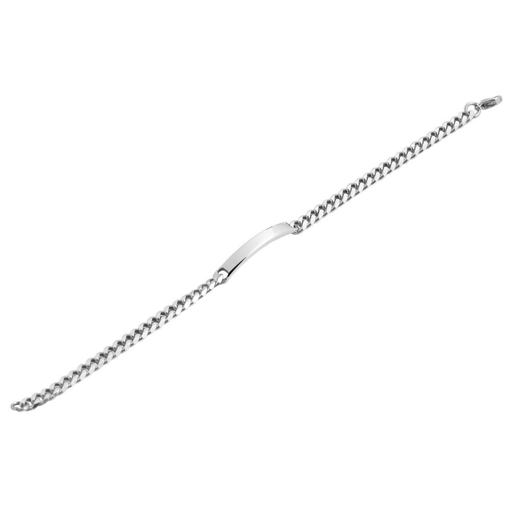 Das silberfarbene Panzerarmband der Marke Akzent ist aus Edelstahl gefertigt und fasst mittig eine 3,5 cm lange Gravurplatte. Die Maße ergeben sich aus einer Gesamtlänge von 22,5 cm, einer Breite von 0,6 cm und einer Materialstärke von 2,5 mm. Die Gravurplatte ist 2 mm stark und ebenfalls 0,6 cm breit. Öffnen und schließen lässt sich das massive Armband mit einem silberfarbenen Karabinerhaken, der ebenfalls aus Edelstahl gefertigt ist. Die Oberfläche des auffälligen Schmuckstückes ist hochglanzpoliert. Die Gravurplatte, oder Identplatte, ist dazu geeignet mit Gravuren versehen zu werden. Ein personalisiertes Schmuckstück eignet sich hervorragend als Geschenk.