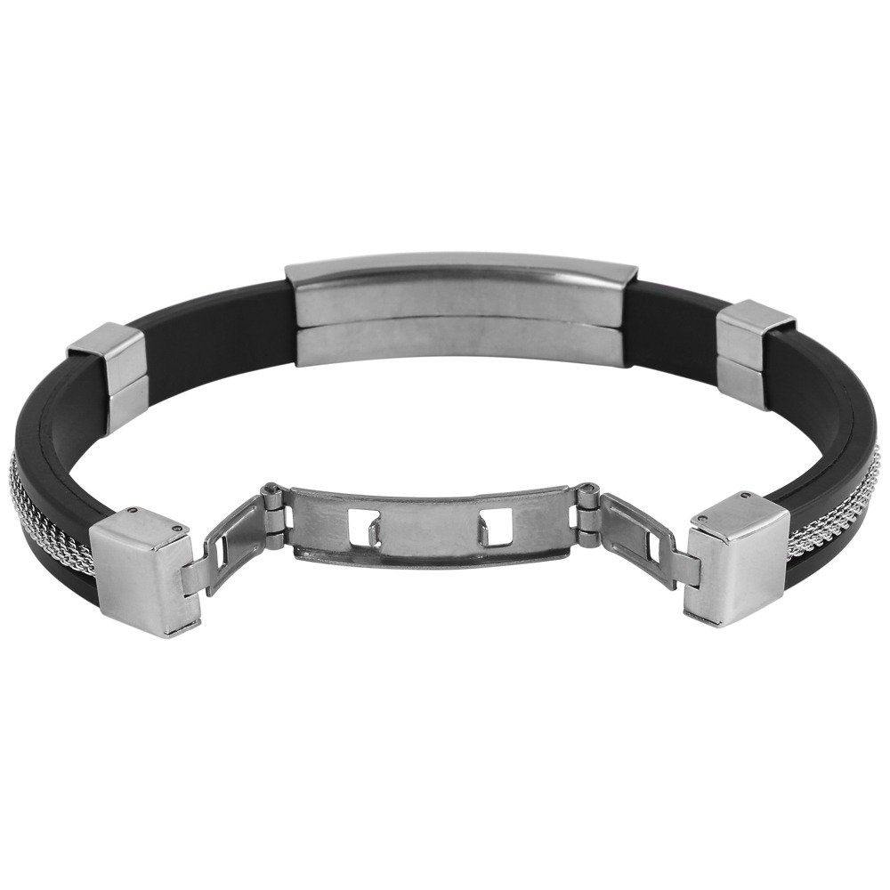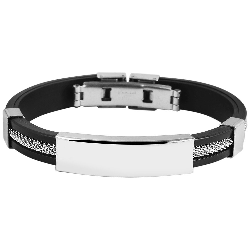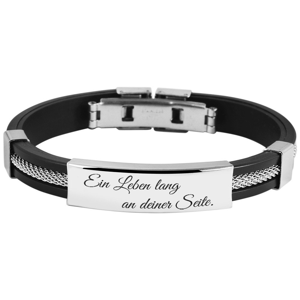Das Armband der Marke Akzent ist aus einem 9 mm breiten Silikonriemen gefertigt. In den Riemen ist mittig eine Kerbe gearbeitet, die mit einem 3 mm breiten Milanesekettchen ausgefüllt ist. Zusätzlich ist mittig an das Schmuckarmband eine 41 x 11 mm große Edelstahl-Gravurplatte und weitere Edelstahlelemente angebracht, die sich für Gravuren aller Art eignen. Die Gesamtlänge des Armbandes beträgt 22 cm. Öffnen und schließen lässt es sich mit einer praktischen Faltschließe, die ebenfalls aus Edelstahl gefertigt ist. Mit diesem Accessoire erhalten Sie ein modernes Schmuckarmband, das sich toll als personalisiertes Geschenk eignet, um seine Liebsten mit einer ganz individuellen Botschaft zu überraschen.